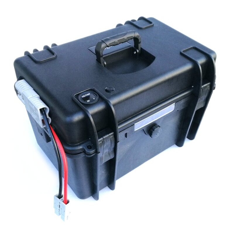 Es kann per Knopfdruck die Akkuspannung auf einer Digitalanzeige abgelesen werden. Im Koffer sind die Zellen mit einer 60A Sicherung abgesichert. Oben befindet sich einer unserer Stecker 120A, der Gegenstecker für den Bootsmotor befindet sich im Lieferumfang. Somit kann ein Elektro Bootsmotor oder auch Ladegerät direkt angesteckt werden. Der Koffer muss im Normalbetrieb nie geöffnet werden, da Ladung und Entladung komplett von Außen durchgeführt werden kann. Einzig im seltenen Falle einer durchgebrannten Sicherung, bspw. durch blockierten Motorpropeller, müsste man den Koffer öffnen um diese zu tauschen.