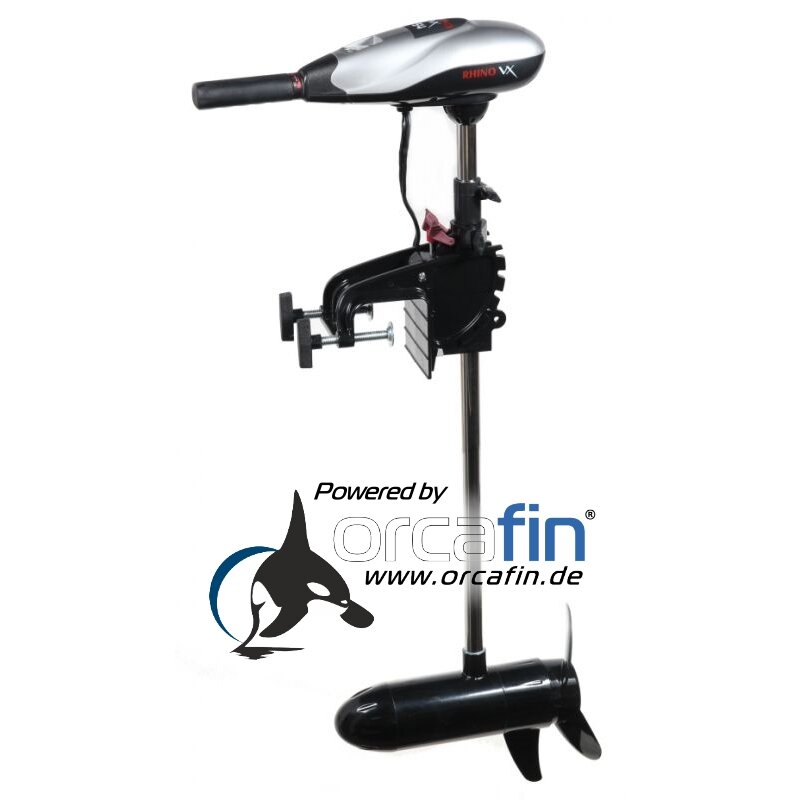 Der Rhino VX 54 Elektro-Bootsmotor mit Orcafin NX-PLUS Upgrade. Sie erhalten somit den Rhino VX 54 Elektromotor mit stufenloser Steuerung. Durch die stufenlose Regulierung ist der Motor nicht nur komfortabler zu steuern, insbesondere beim Schleppangeln oder Vertikalangeln, er verbraucht im kleinen Lastbereich auch rund 50% weniger Strom! Es hört sich unglaublich an, ist aber kein Rechentrick, Sie können mit dem selben Akku doppelt so lang fahren, verglichen mit dem Originalmotor. Außerdem wird das anfälligste Bauteil, der Stufenschalter durch eine deutlich robustere Elektronik ersetzt, welche sich bei blockiertem Propeller selbst abschaltet und einen Warnhinweis ausgibt. Sie erhalten eine längere Fahrtzeit, komfortablere Steuerung und eine robusteren Motor, als mit Originalschalter.